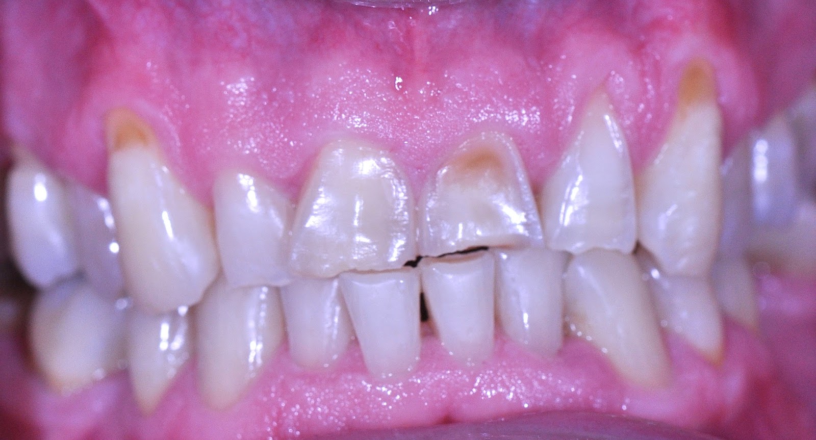 The patient has his upper anterior teeth wear and severe enamel loss from nail biting habit. Edelweiss veneers can improve his incisal tooth length and shape. Result is a big esthetic improvement of his smile.